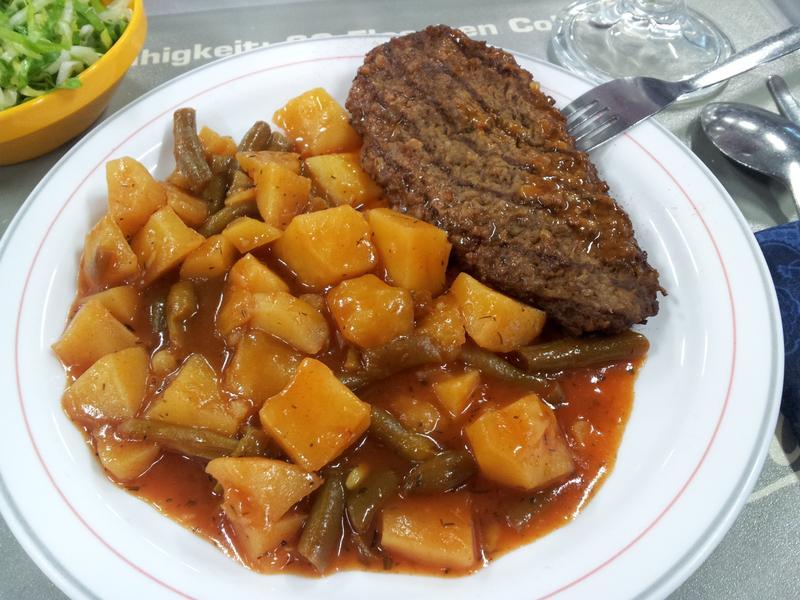 | Bohnen-Kartoffelgemüse sieht schlimmer aus als es schmeckt, hacksteak selber ist relativ Lecker, aber oft ne relativ kleine Portion | |