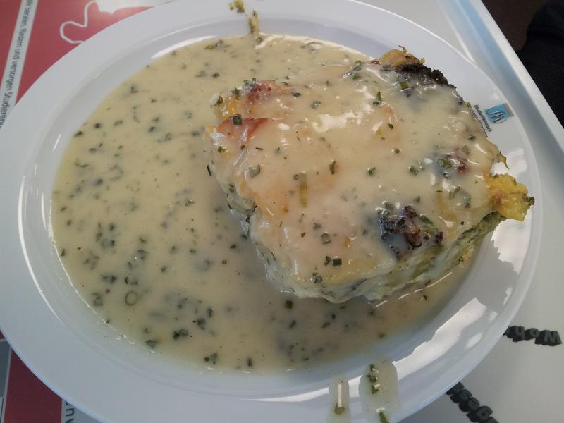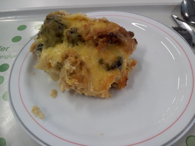 Heute mit Käsesoße (!) die tatsächlich erstaunlich käsig war. Auflauf in Verbindung damit richtig gut!