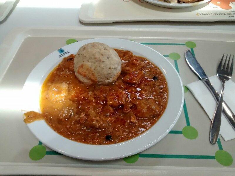 | Gutes Gulasch mit Kraut und kräftiger Kümmelnote. Die Bezeichnung mit Sauerkraut ist übertrieben, davon war rein gar nichts zu merken. Leider war das Fleisch, weil sehr klein geschnitten, zu durch und deswegen hart. | |