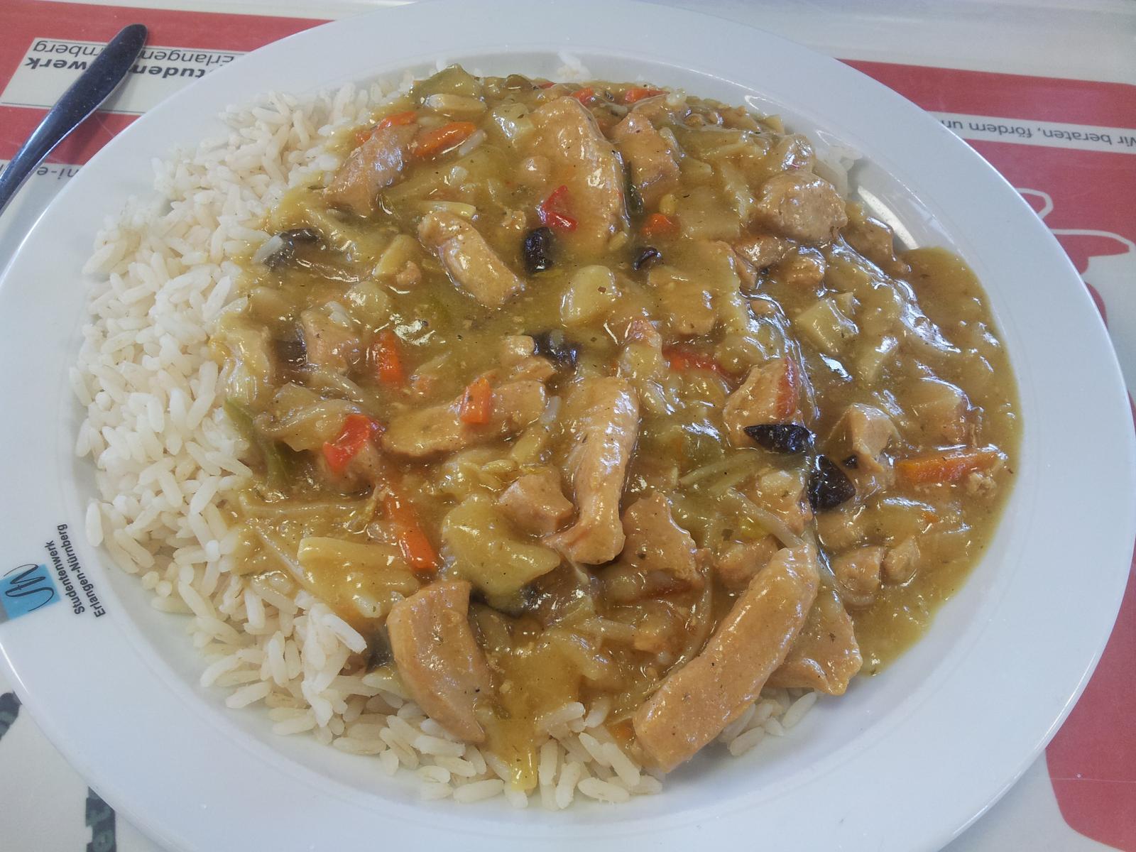 | Weiß nicht was da Curry im Namen verloren hat. Aber das Putengeschnetzelte mit Gemüse und Kokosmilch(Geschmack von Kokos nicht zu intensiv,sehr gut !) ist absolut empfehlenswert.jawoll | |