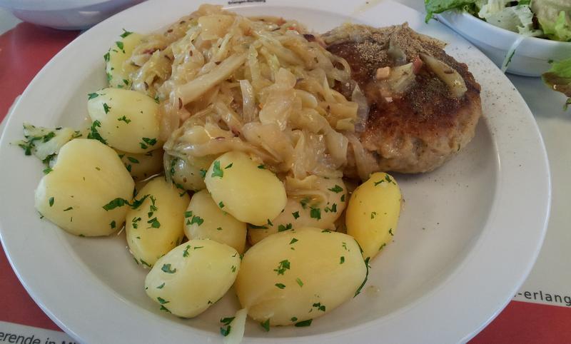 | Leckeres Kraut, Hacksteak war wie immer (Geschmackssache halt) und dazu gab es leckere Kartoffeln. Soße leider sehr dünnflüssig, wurde mit dem sauerkrautsaft doch arg wässrig. Dennoch eine große, satt machende Portion und etwas Abwechslung auf dem Teller, wer es etwas bodenständiger mag. | |