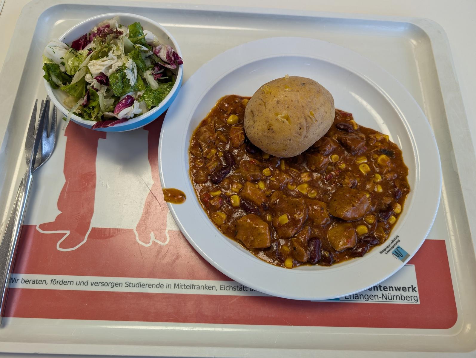 | Ein überraschend gutes Essen. Die Ofenkartoffel sah auf den ersten Blick nicht so super aus, war dann aber doch ganz in Ordnung. Das Fleisch war schön zart und das Gulasch gut gewürzt. Es hätte nur ein bisschen mehr sein können... 4.5/5 | |