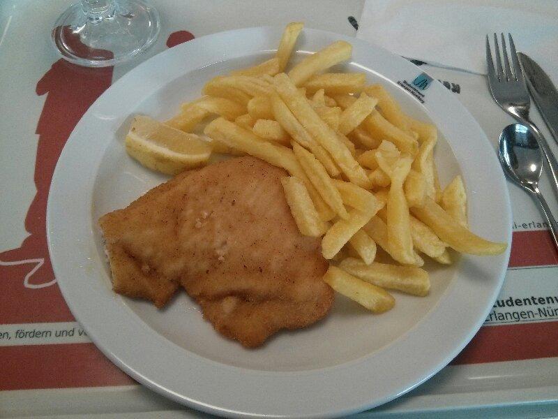 | unerwarteter Weise sogar Spuren von käse im cordon bleu. kartoffelstäbchen intensiv im lauwarmen fett eingeweicht. kalorienhaltiger Traum für jede polarexpedition | |