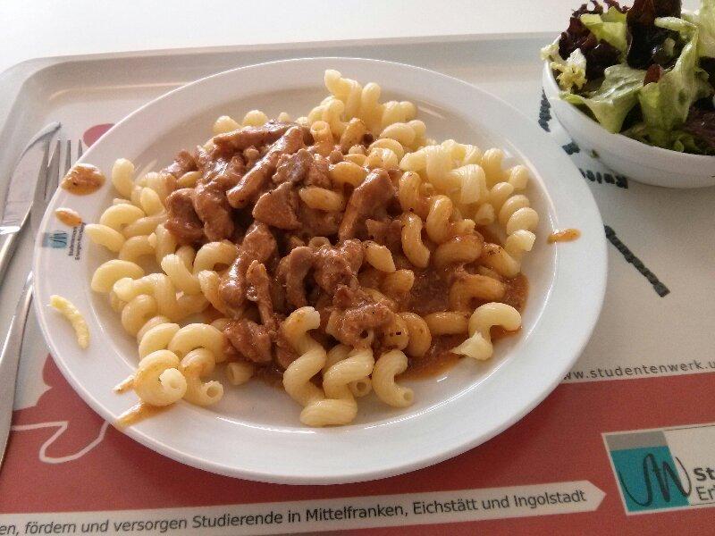 | Das Essen war für die Mensa sehr lecker. Allerdings war es eine sehr kleine Portion Nudeln mit einem noch kleinerem Klecks Geschnetzeltem drauf. | |