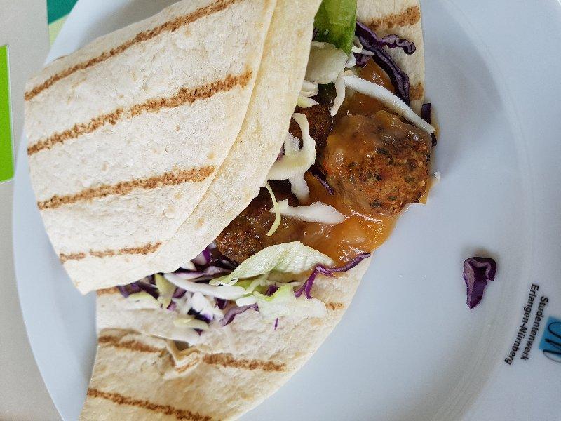 | Großes Lob an die Mensa! Ein richtig gutes Essen, das wieder geben darf. Der Wrap war gefüllt mit Eisbergsalat, Blaukraut, Frühlingszwiebel, Falaffelbällchen und Pfirsich-Chutney. | |