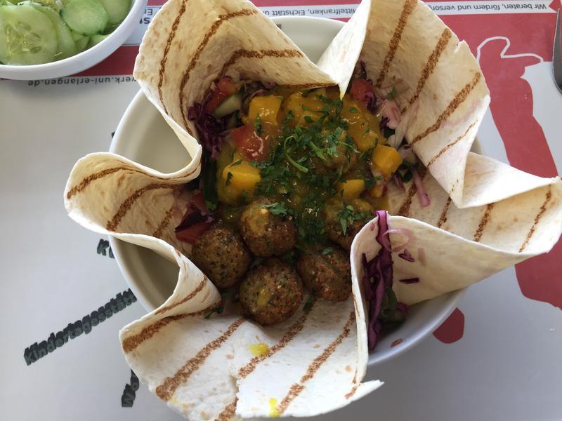 | Eines der schmackhaftesten Gerichte in der Mensa, auch wenn es ohne Fleisch ist. :) Ich freue mich immer wieder 'drauf. Die Falafel sind wirklich gut gelungen und das Pfirsich-Chutney passt auch sehr gut dazu. Des Weiteren macht es tatsächlich äußerst satt. 5/5. | |
