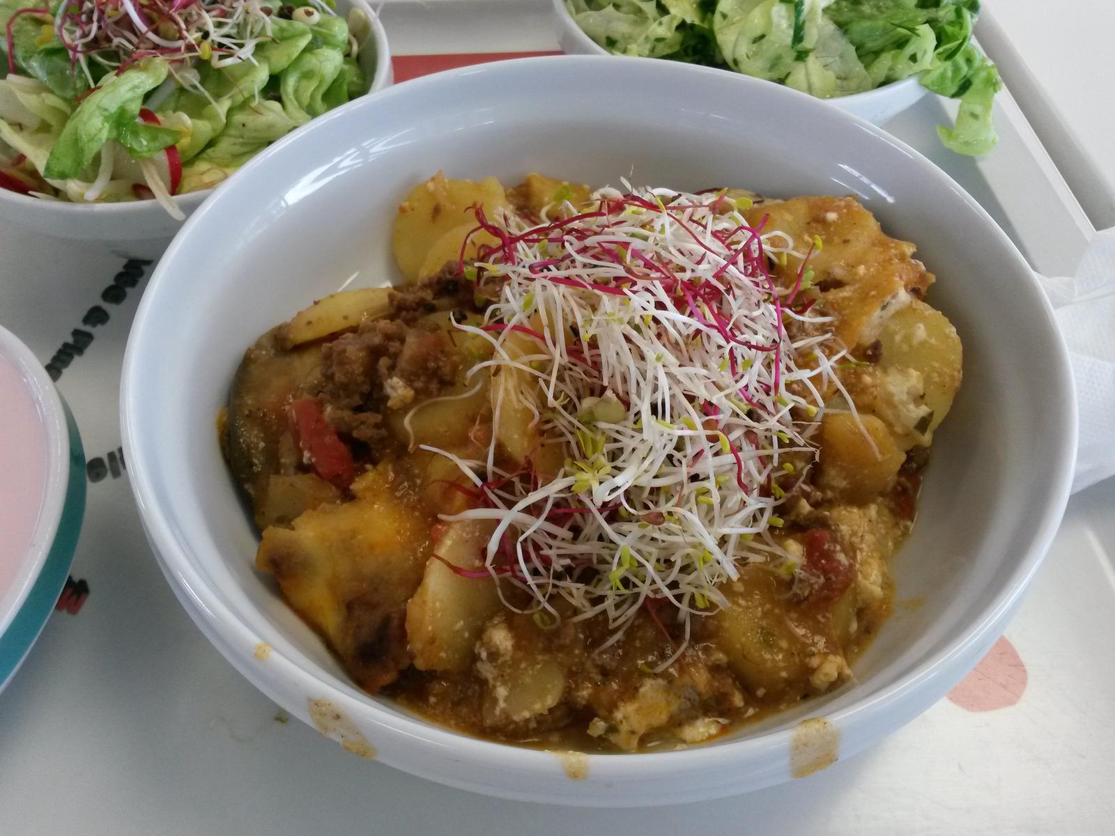 | Im Prinzip ein vielversprechendes Gericht, aus dem was werden koennte, aber bis dahin muss die Mensa noch etwas ueben: Das Kresse/Sprossenzeug obendrauf war aus irgendeinem Grund staubtrocken - es sah zwar toll aus, aber es schmeckte nicht gut. Die Kartoffeln waren teilweise noch etwas zu sehr "al dente". Und ueberall waren irgendwelche dunklen kluempchen die beim draufbeissen knusprig waren, aber nach absolut gar nichts schmeckten - k.A. was das sein sollte, aber lasst es einfach weg. Das Grundgericht an sich war allerdings durchaus brauchbar, wenn auch Mensatypisch etwas zu wenig gewuerzt, aber das ist ein Problem das sich mit dem Bereitgestellten Salz und Pfeffer leicht loesen laesst. | |