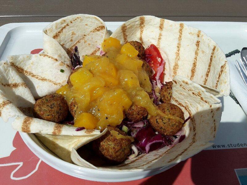 | Eines der schmackhaftesten Gerichte in der Mensa, auch wenn es ohne Fleisch ist. :) Ich freue mich immer wieder 'drauf. Die Falafel sind wirklich gut gelungen und das Pfirsich-Chutney passt auch sehr gut dazu. Des Weiteren macht es tatsächlich äußerst satt. 5/5. | |