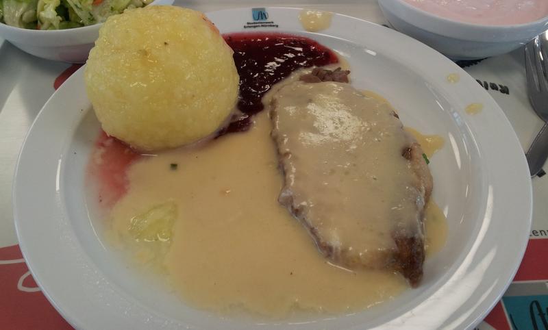 | Fast wie im Restaurant und das zu einem guten Preis (3 europäische Geldeinheiten). Sauce hatte gutes Aroma, geschmacklich wie olfaktorisch, auch die Preiselbeeren passten prima. Das Kloß war relativ groß und ordnungsgemäß. Falls Mensaangehörige mitlesen: klares Lob, ein gutes Mittagessen. | |