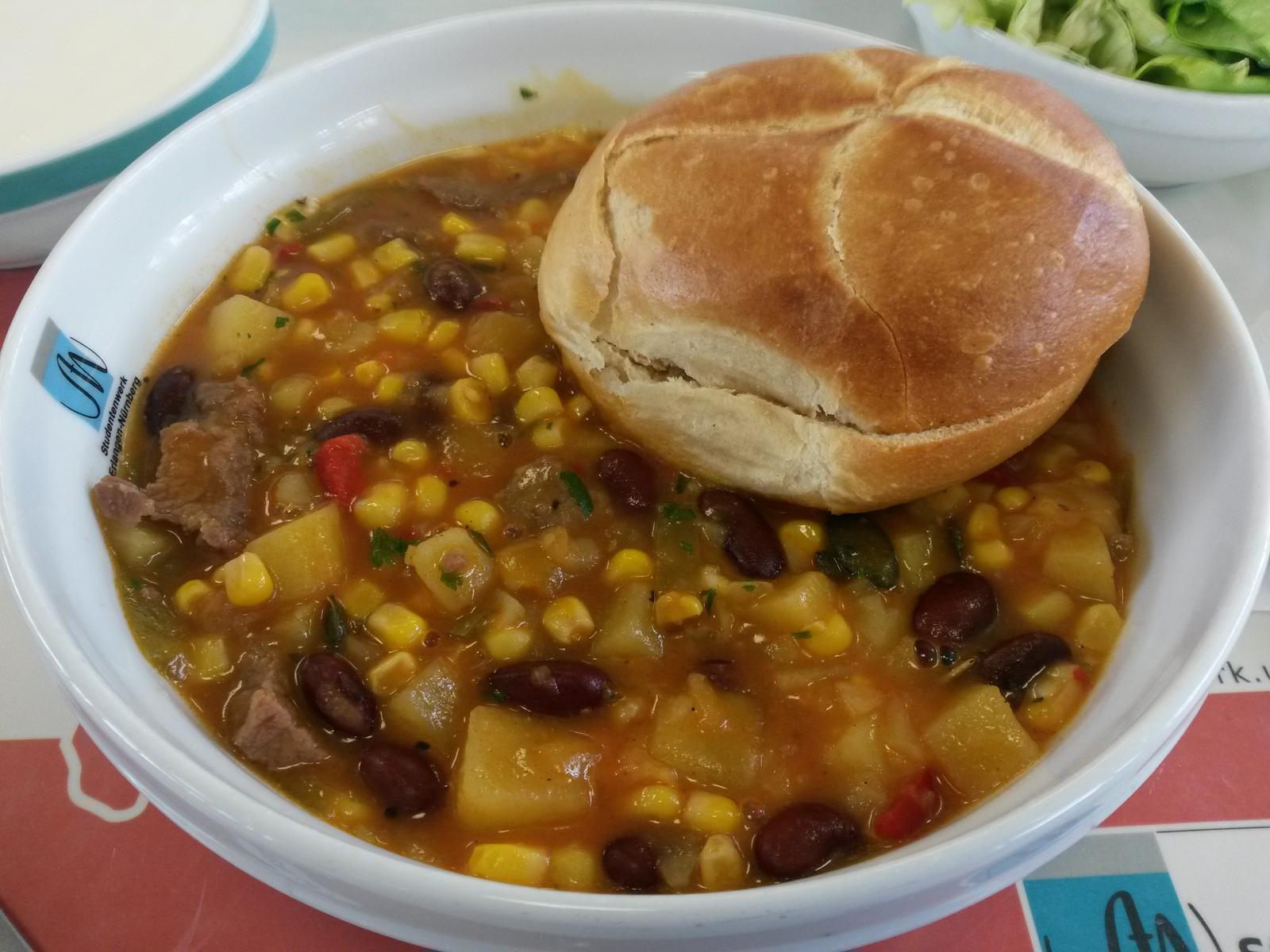 | Kann grunis Kritik nicht nachvollziehen. Diese Woche war das Gericht tatsaechlich mit Baguette statt trockenem Broetchen, das Baguette war nicht sensationell aber OK. Auch die Kuerbiskerne fand ich keine schlechte Idee. Gericht war lecker, wuerde wieder essen. Mein Einziger Kritikpunkt betrifft nicht das Essen: An der Ausgabe wurde das Baguette teils grossflaechig auf das Chili gelegt, was es dann etwas schwer machte das anzufassen, weil es halt ueberall voll Chili war. | |
