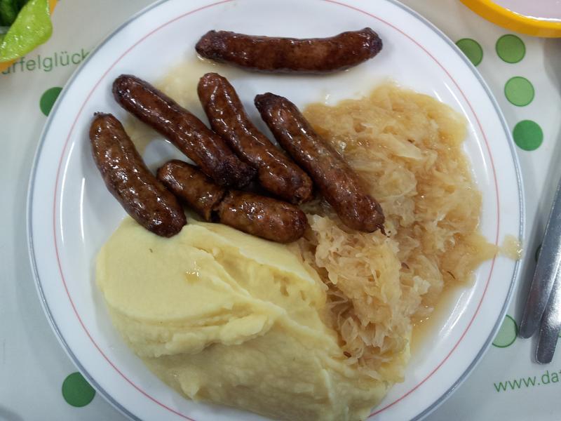 Sauerkraut und Kartoffelbrei heute geschmacklich nicht so der Hit, Bratwürste gut. Unterm Strich noch OK.