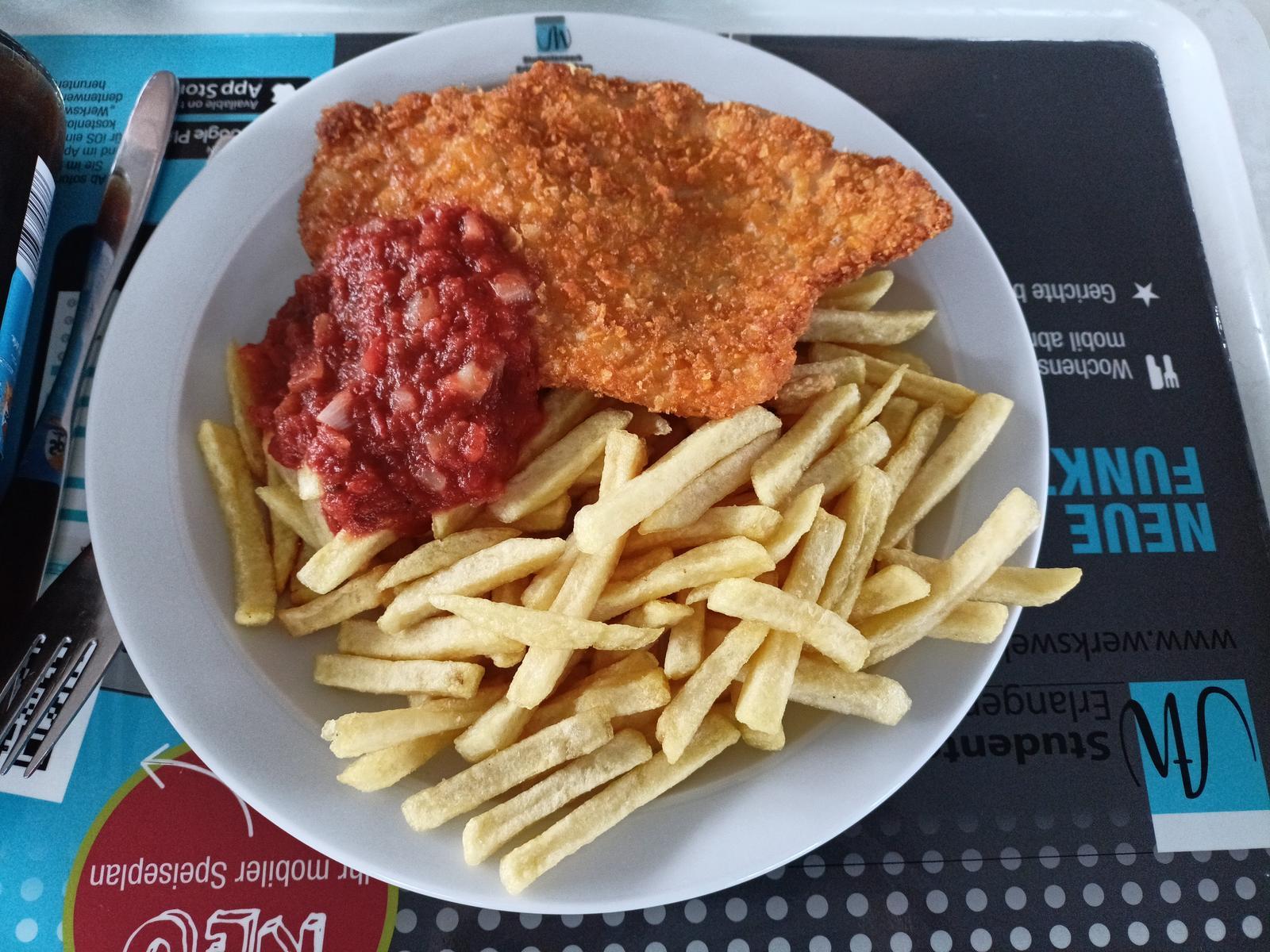 | Entgegen der Grundregel paniertes Fleisch in der Mensa zu meiden, musste ich mich notgedrungen dafür entscheiden. Ich muss sagen, das Fleisch war überraschend knusprig und gut im Gegensatz zu den kalten Pommes. Solide 3/5 | |