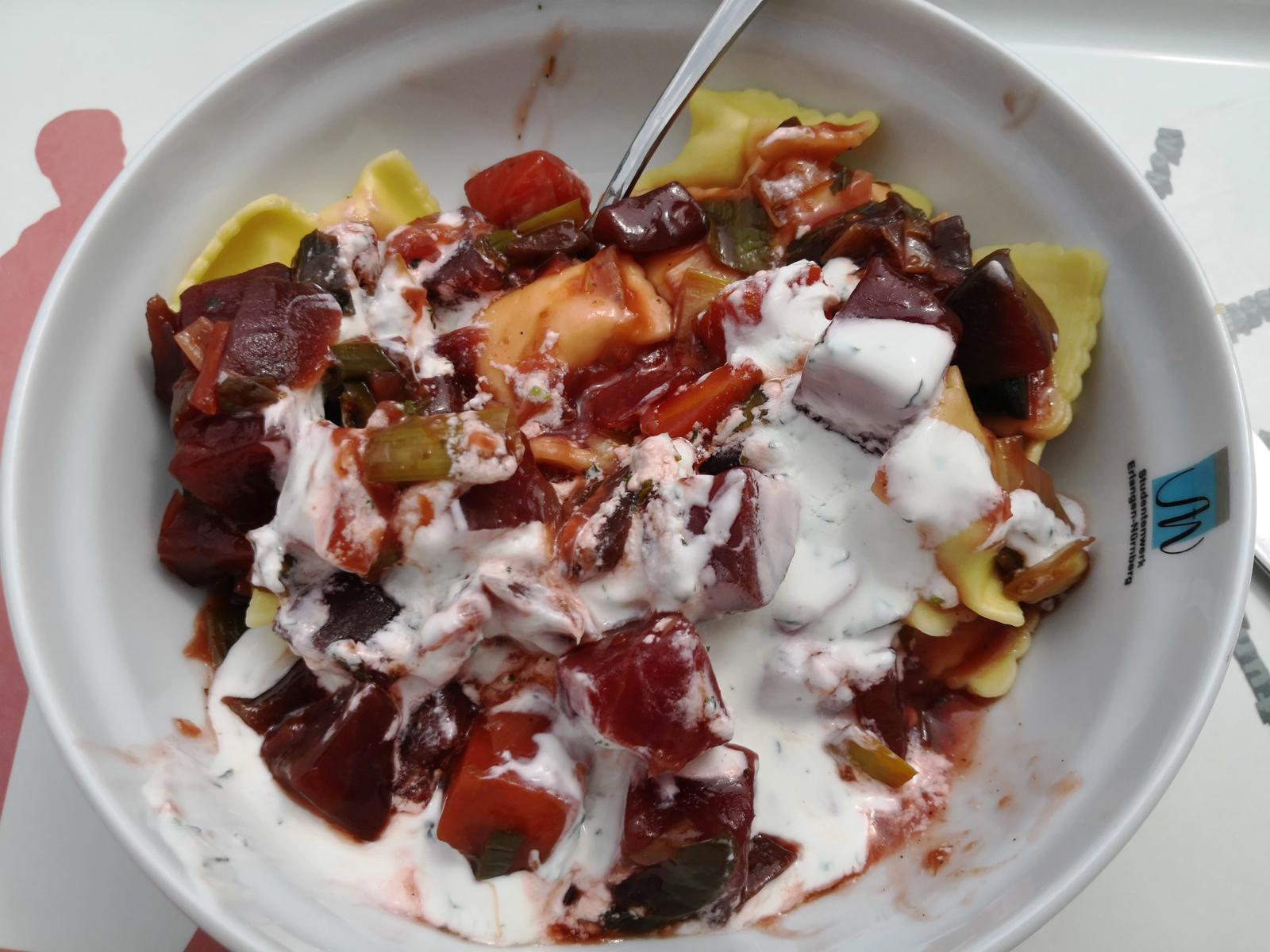 | Die raviollini haben keinen Geschmack, die rote bete ist geschmacklich völlig unpassend. Nur die Nudeln und sour cream schmecken zusammen aber ganz gut, soweit sich die beiden in dem gemenge trennen lassen. Kaufe ich nicht wieder. | |