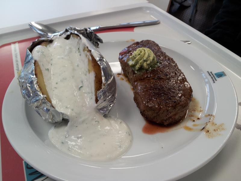 | War sehr englisch das Steak mit gefrorener Kraeuterbutter drauf... Die Fleischqualitaet konnte sich aber sehen lassen, Pommes waren auch essbar. Koennte also sein, dass ich ab sofort mehr Geld in der Mensa lasse an Linie S... | |
