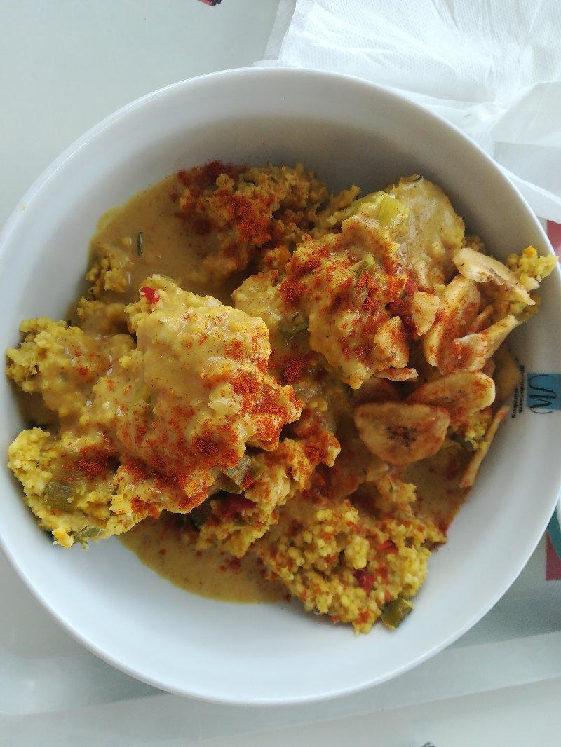 | Die erste Hälfte des Tellers war ganz nice, aber ab der Zweiten konnte die fade Sosse und die Hirsepampe (mit übrigens maximal wenig Gemüse) meine Zunge leider nicht mehr begeistern 2.5/5 Sternen | |