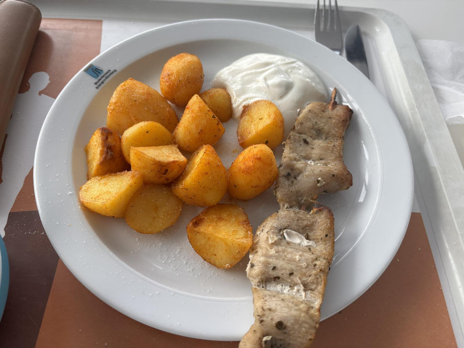 | Das Fleisch sieht so aus als hätte man es in einer Mikrowelle zubereitet. Dafür ist es jedoch noch essbar. Tzatziki und Kartoffel lecker. | |