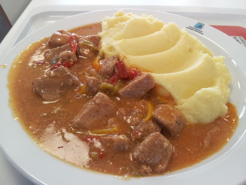 War tatsächlich essbar. Heute mit etwas, was von weitem so tat, als wären es Kartoffeln. Leider musste ich doch feststellen, dass es tatsächlich die angekündigten Klöße waren. Sehr gummiartige Konsistenz und nicht wirklich schmackhaft. Das Gulasch war aber echt richtig lecker, vor allem die Paprika darin. 8/10 would eat again
