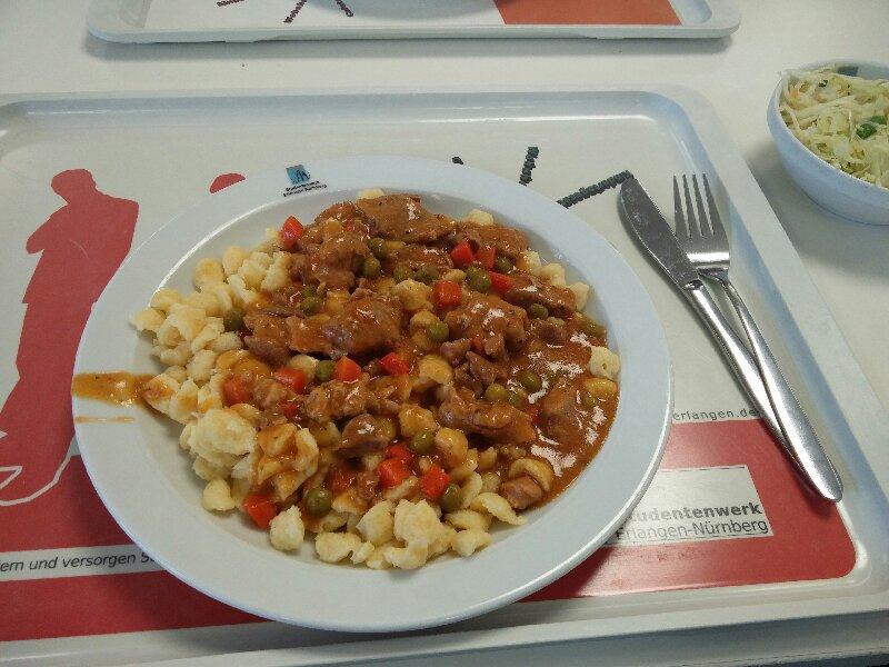 | Das Gericht hieß heute „Gärtnerin Art“. Leider mit viel zu viel Soßenbinder zubereitet, Konsistenz teils schleimig. Hat sonst aber gut geschmeckt, weswegen ich es leider aufgegessen habe. Hatte zur Folge, dass mir das erste mal nach Mensaessen richtig schlecht wurde. Geht gar nicht! Ich bewerte es noch gnädig mit 2/5, weil der Geschmack gepasst hat. | |