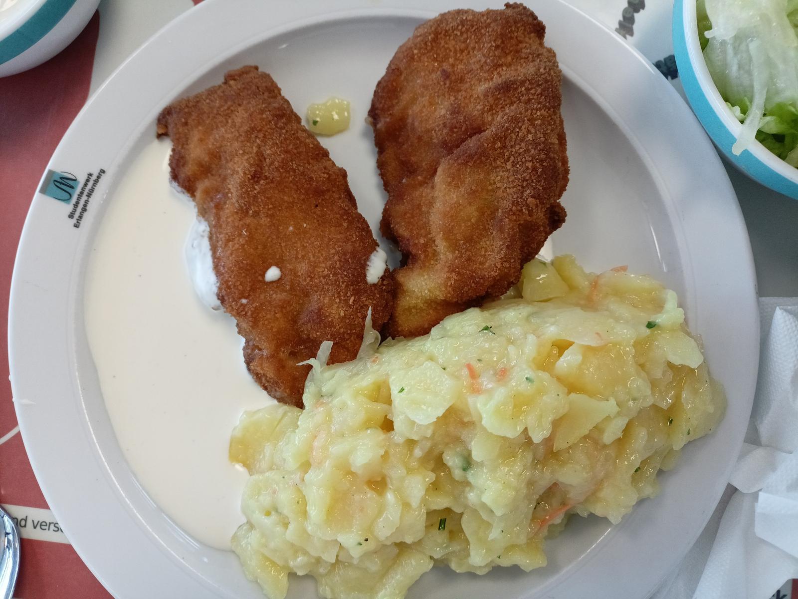 | Entgegen der Meinung anderer Leute finde ich die Hähnchenkeulenschnitzel richtig lecker! Hähnchen+Panade, was will man mehr, um glücklich zu werden? | |