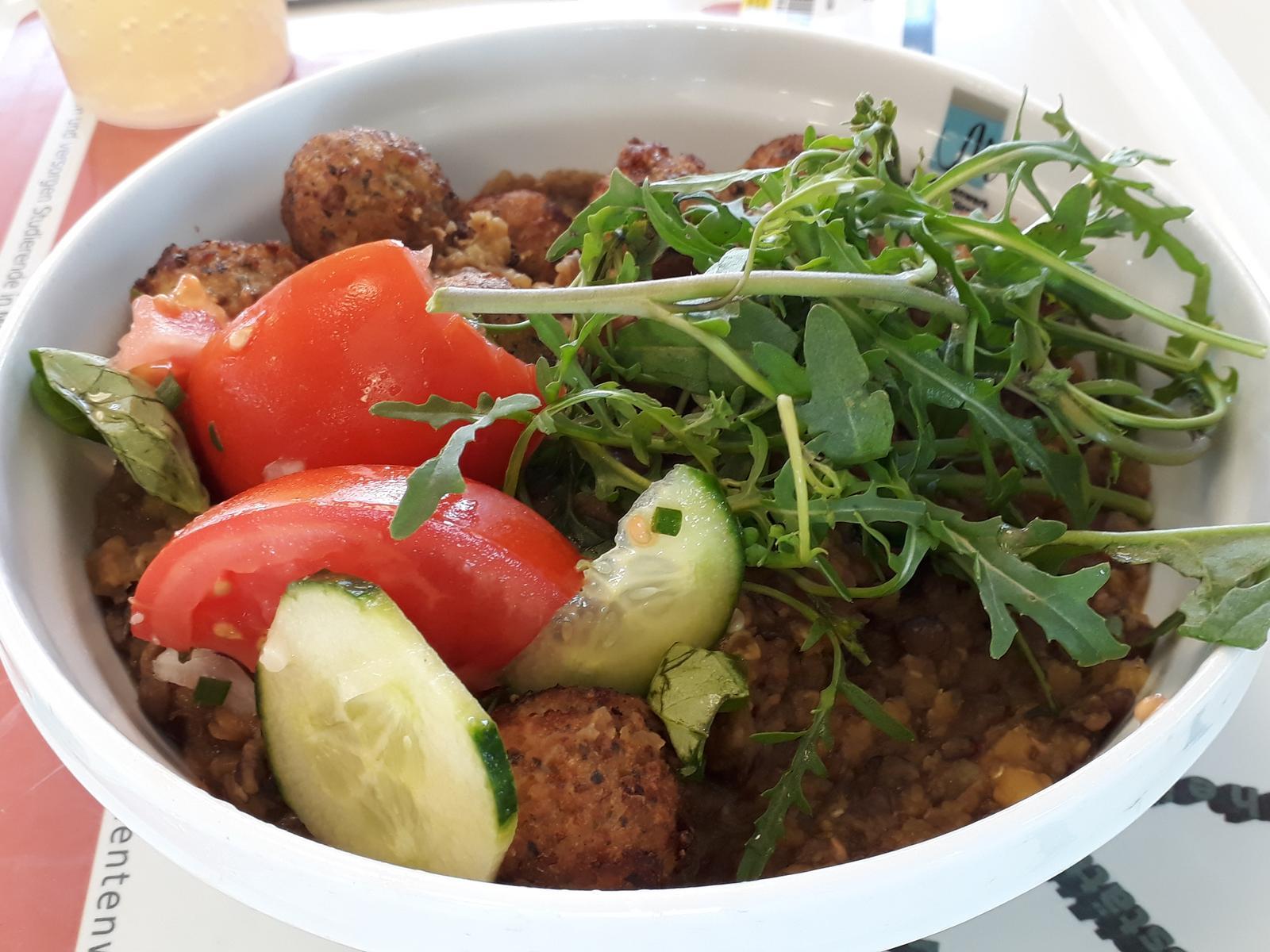 | Geschmacklich gut, aber das Verhältnis von Linsen und Falafel zu Salat war nicht gut. Dreimal mehr Salat und halb so viel Linsen/Falafel wären gut gewesen. | |