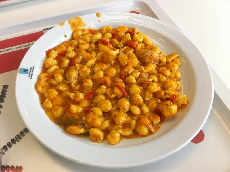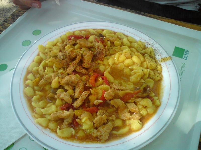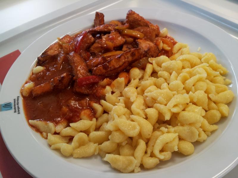 | Das Fleisch war zwar nur Pressfleisch und mit dementsprechend wenig Geschmack. Sosse und Spaetzle dafuer gut. Insgesamt sehr gut essbar fuer Mensaverhaeltnisse. | |