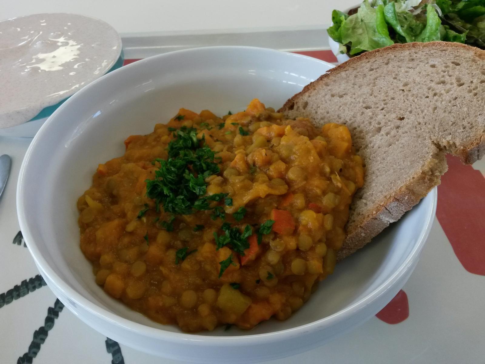 | Heute mal richtig schlecht, keinerlei Geschmack & Gewuerz (ausser dem druebergeworfenen Koriander), nichtmal Salz (und da ist die Mensa eigentlich sonst nie geizig damit...). Couscus mit vielzuviel Fluessigkeit, daher Matsch, zusammen mit komplett matschigen Gemueseresten aber keinerlei Spuren von Apfel oder Nuessen. | |
