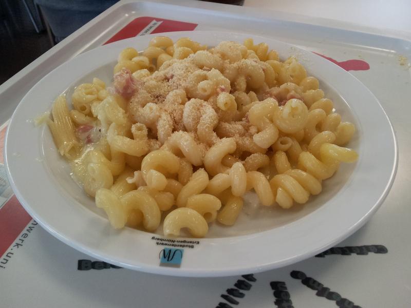 | gabs wieder einmal als tipp des tages. nudeln in gewohnter mensaqualitaet. carbonarasauce war letztendlich sahne mit rauchgeschmack. macht letztendlich besser satt als gluecklich. | |