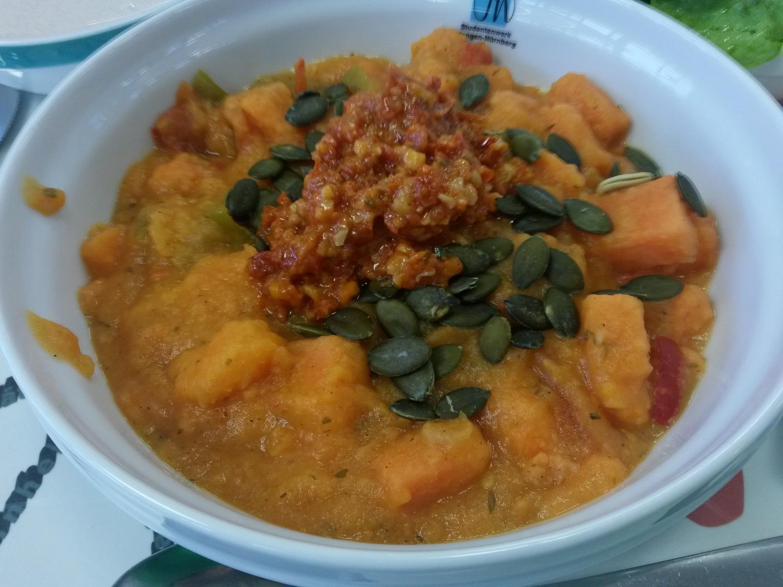 | Nice! Süßkartoffeln und Sonnenblumenkerne sind eine herzallerliebste Paarung, jetzt auch in der mensa. Frohlocken und Jauchzen. | |