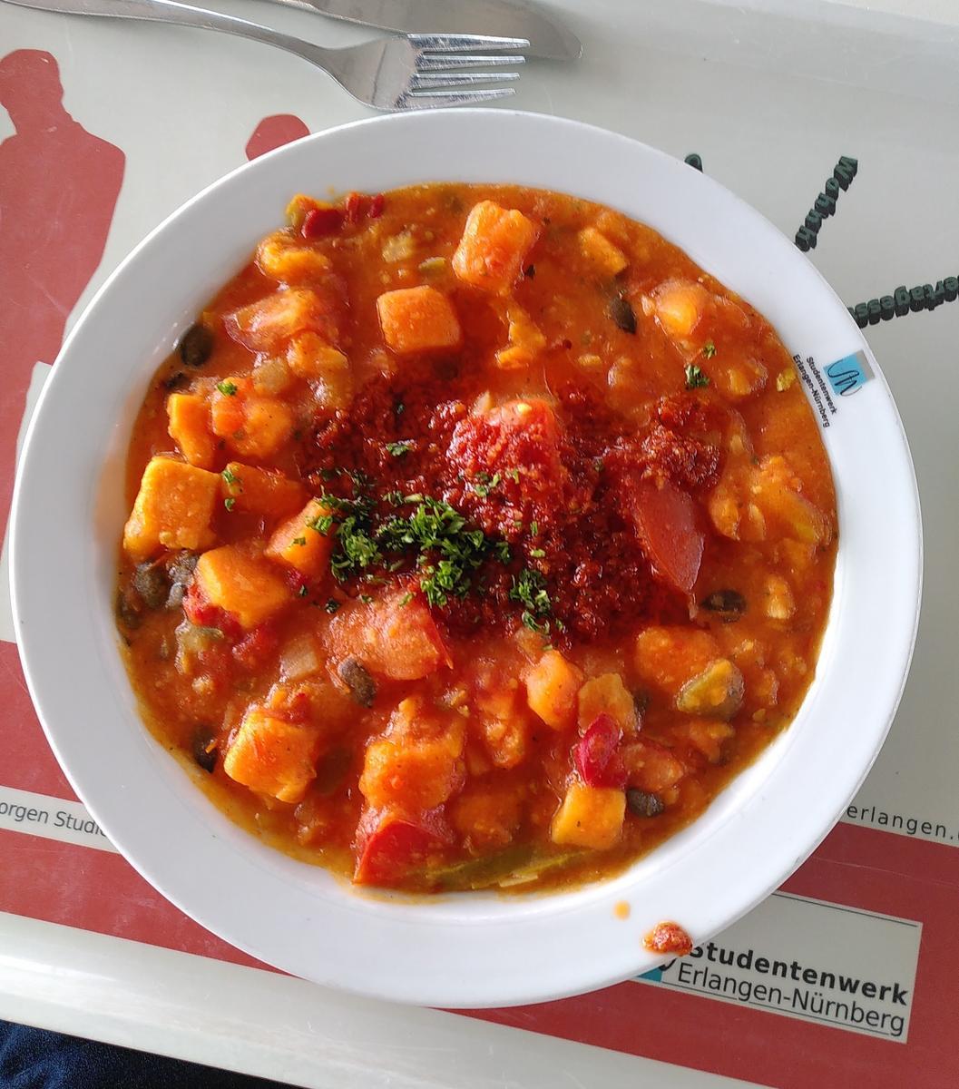 | ich fands für Mensa Verhältnisse richtig lecker und das will was heißen. die Süßkartoffeln sind nicht allzu süß, ich finde, sie haben eher nach Kürbis geschmeckt und wenn man das Pesto gut verteilt, mischt sich die Süße gut mit der Säure. 4,5/5 Mensa Sterne | |