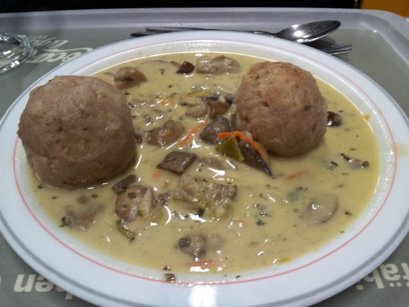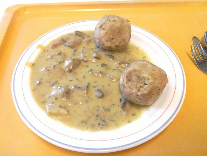 die Sauce war für Mensaverhältnisse echt gut! Man konnte sogar Pilze erkennen und schmecken. Aber der Semmelkloß war nicht durch und viel zu hart. Ich musste einen ganzen kloß liegen lassen (und das soll was heißen)!