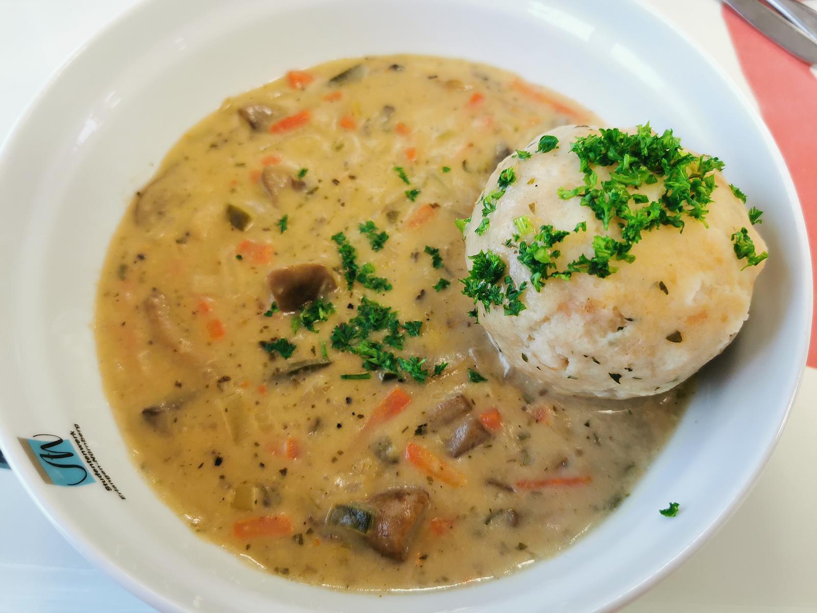 | Ein großer, fensterkit-gleicher Semmelkloß mit glibbrigen Pilzen und Karrotenstückchen in typischem Mensaschlonz. Wer Pilze mag und den Schlonz verdauen kann wird sich über dieses Gericht freuen. | |