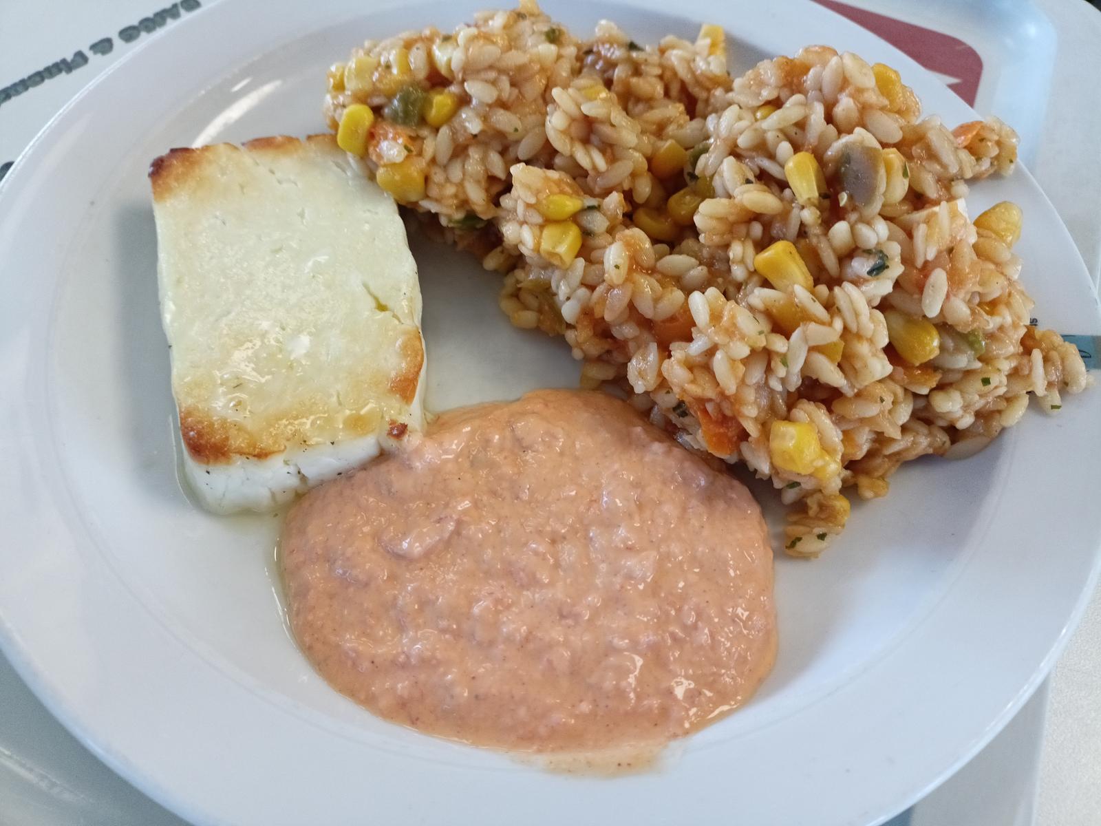 (5)| Ich fand's heute lecker. Kritharaki-Salat gut gewürzt, selbst die Ayvarcreme war OK (wenn sie auch wenig mit Ajvar zu tun haben mag). Der Halloumi hatte einen kräftigen Geschmack, vielleicht Geschmackssache, aber in jedem Fall keine billige Kuhmilchalternative. | |