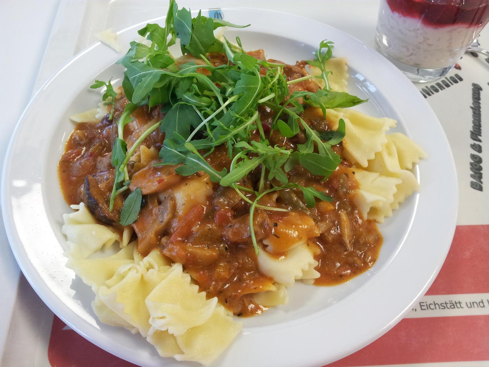(100)| Ist eines der besseren Geschnetzelten. Es ist viel Gemüse drin und Grünzeug oben drauf. Diesmal war zwar nicht die Soße, aber leider die Nudeln Matsch. 4/5 | |