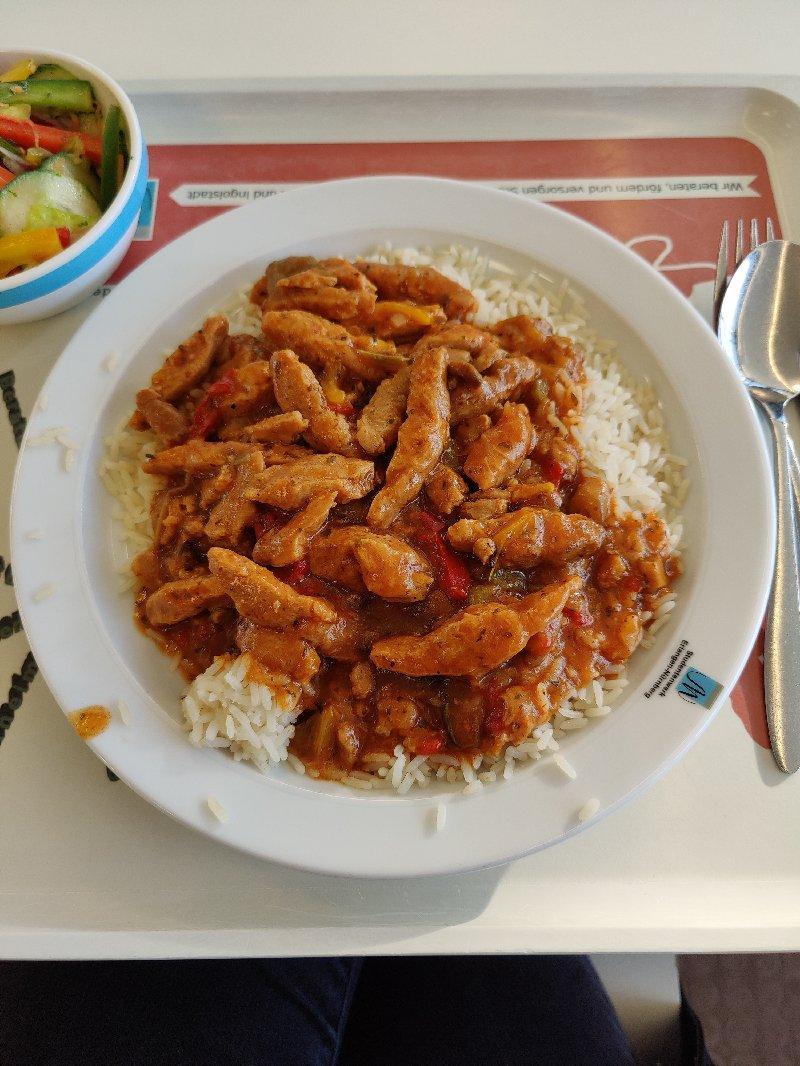 | War gut, die Curry-Sosse sogar sehr gut, mit angenehmer Senf-Note. Der Kartoffelsalat mit Erbsen und Möhren war auch besser als die Standard-Version, gerne öfter. | |