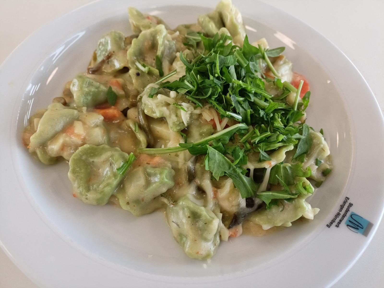 | Die Tortellini waren heute grün und die Soße war nicht auf Gemüseschleim- sondern auf Tomatenbasis. Sie hatte sogar vergleichsweise viel und auch innovatives Gemüse intus (zB Staudensellerie). Und weil Tortellini eh die besten Mensanudeln sind, war das Gericht wirklich zu empfehlen. | |