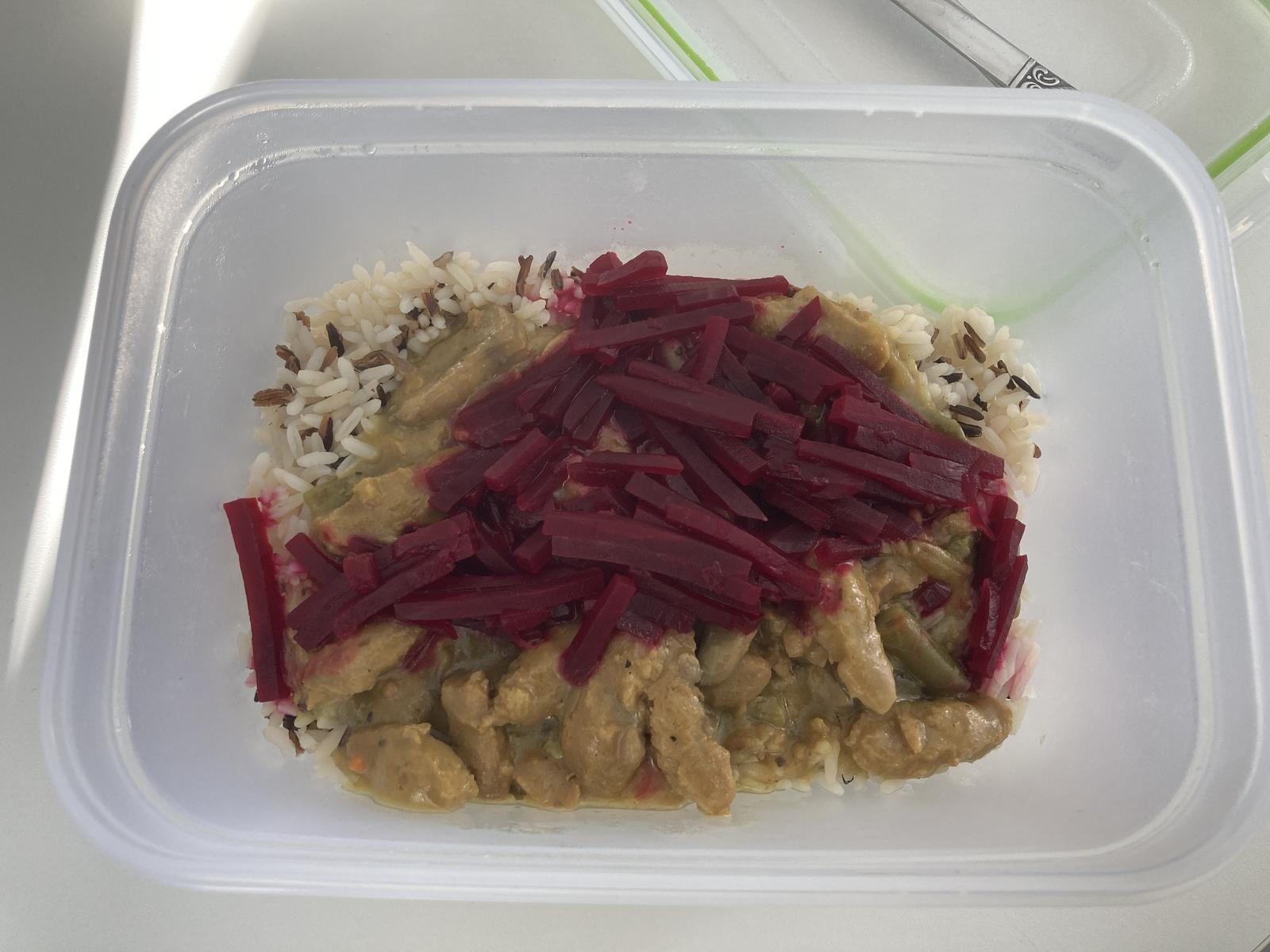 | Heute ohne rote Bete Streifen, aber echt lecker! Die Portion war groß genug um satt zu werden, der Reis nicht zerkocht und das Gemüse noch leicht bissfest. Die Sojastreifen hatten eine gute Konsistenz, könnten nach meinem Geschmack aber etwas mehr gewürzt sein.Ein sehr solides Gericht, ich vergebe 4,5/5 Sternen | |