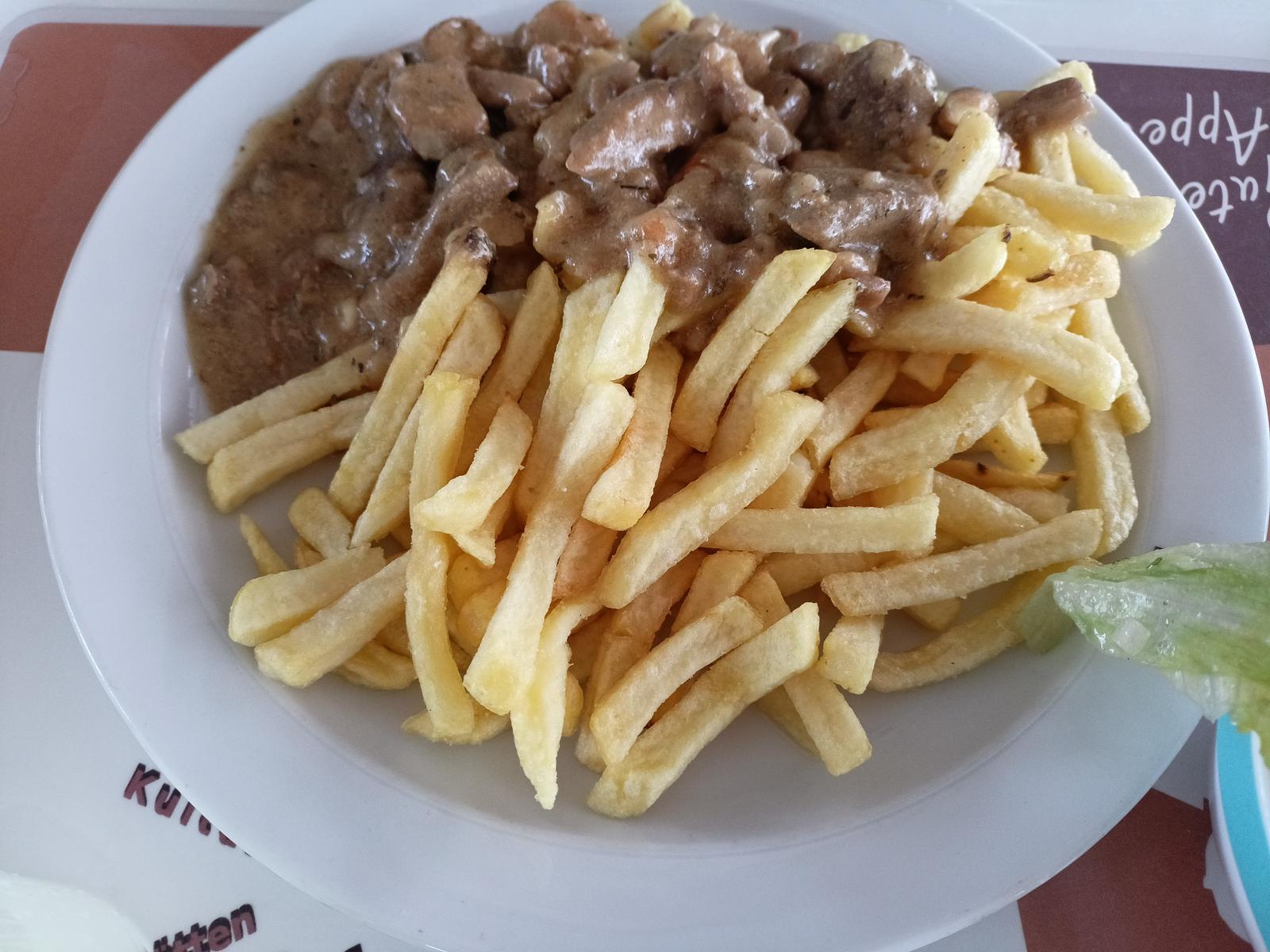 | Schmeckt wie das Standard Mensa Gulasch. Pommes passen als Beilage eigentlich auch nicht. Aber hey für 3¤ kriegt man so ne ganz gute Mahlzeit. | |