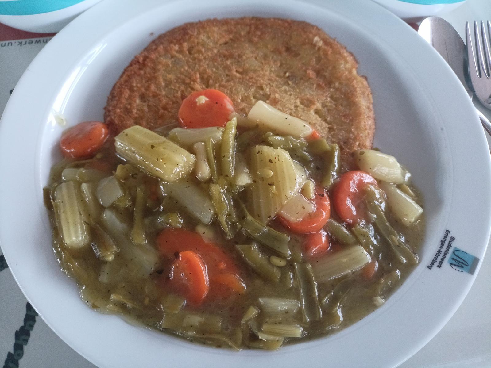 | Das Kartoffelrösti ist an den Seiten schön knusprig und ebenfalls auch gut gewürzt. Das Wintergemüse hingegen war weniger appetitlich und könnte von meiner Seite aus auch das nächste Mal weggelassen werden. Trotz allem ein solides Gericht | |
