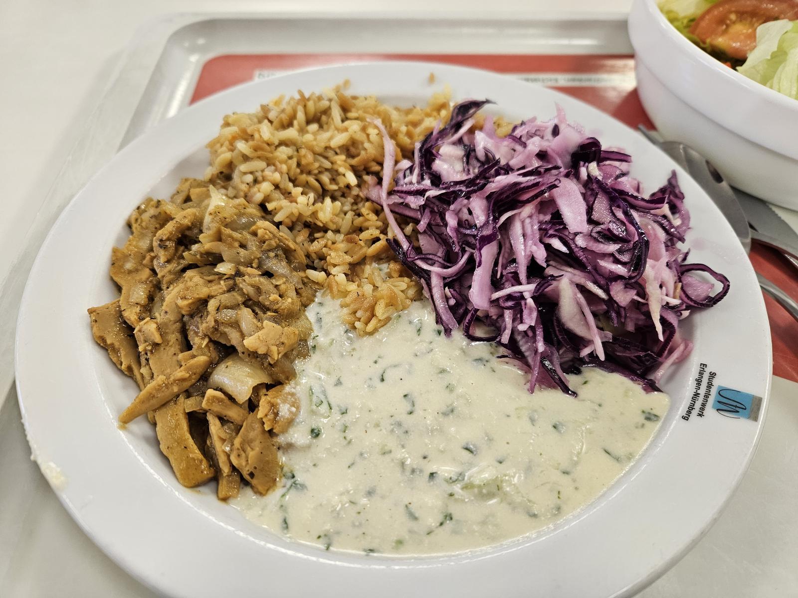 | Der vegane Dönerteller war bis zuletzt ein absolutes Highlight der Mensa und bis auf leichte Variationen in der Qualität des Reisnudelsalats . Leider wurden dieses Mal die sehr leckeren, gut gewürzten Sojastreifen durch irgendetwas anderes, absolut ungenießbares (sah nach Seitan o.ä. aus) ersetzt. | |