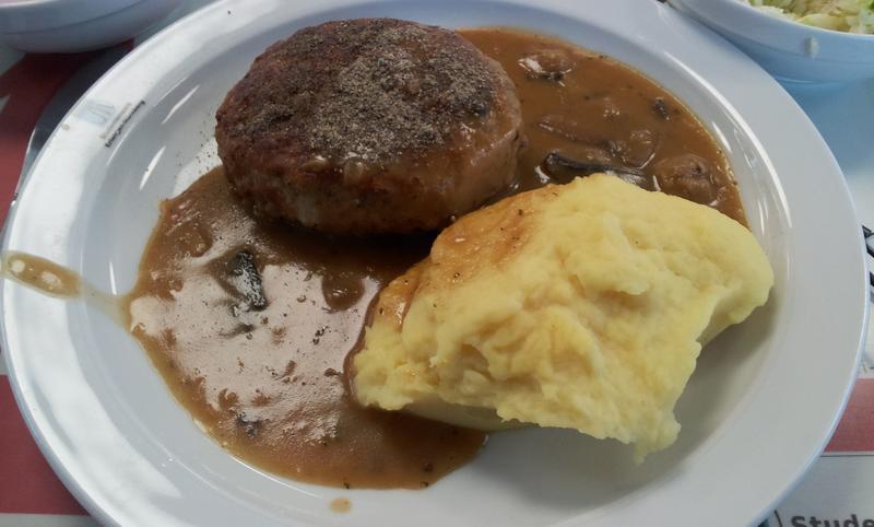 Erstaunlich gute Pilzsoße, die sogar nach Pilzen schmeckt. Hacksteak so wie immer mittelmäßig...