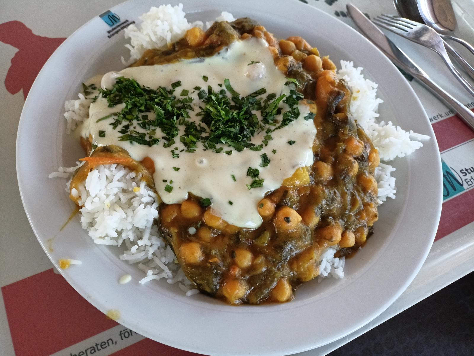 | Das Gericht roch auf der Theke sehr lecker. Mensauntypisch war das Curry auch wirklich scharf und würzig und der kleine Klecks Soße obendrauf war auch lecker. Leider haben die Kichererbsen den Geschmack gestört. Diese waren noch wirklich hart, man hätte sie länger quellen lassen sollen, deshalb nur 3/5. | |