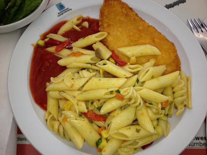| Entgegen der Grundregel paniertes Fleisch in der Mensa zu meiden, musste ich mich notgedrungen dafür entscheiden. Ich muss sagen, das Fleisch war überraschend knusprig und gut im Gegensatz zu den kalten Pommes. Solide 3/5 | |