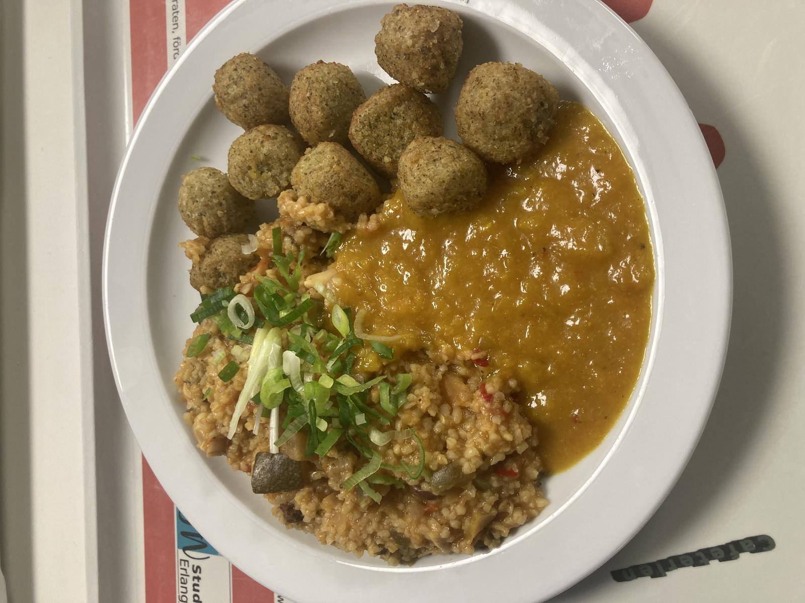 | Optisch mensatechnisch überragend. Falafel aber irgendwie ne weirde Kombi aus geschmacklich weichem, aber nicht rohen Teig. Chutney braucht man jetzt nicht. Fast 30g Zucker für ein herzhaftes Essen auch etwas, was die Mensa hier zuverlässig bietet. | |