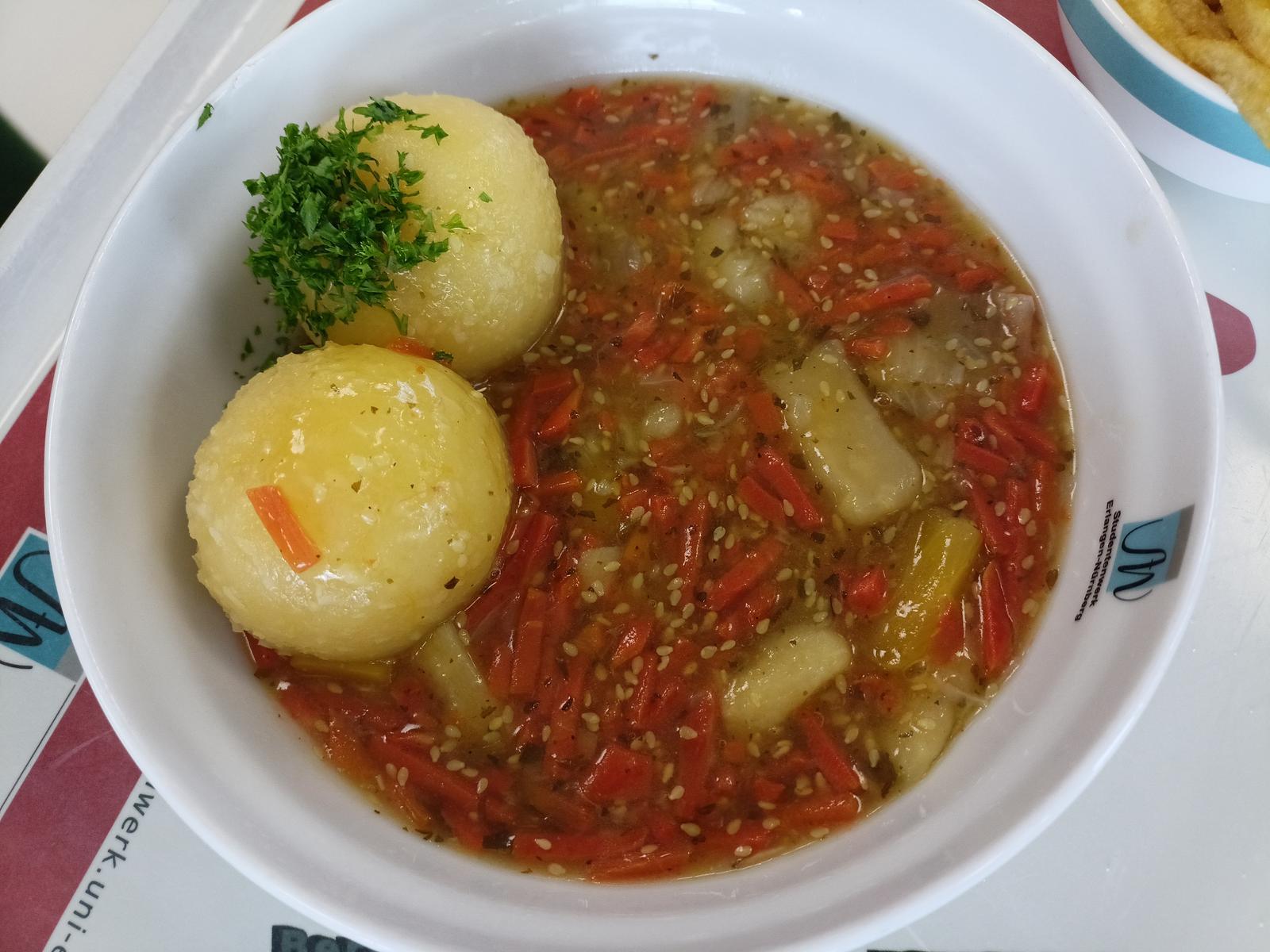 | Dies war seit einem halben Jahr das erste Gericht aus der Mensa dass ich wirklich schlecht fande. Ich weiß nicht, ob das Gericht an anderen Tagen schon besser war, aber heute war es eine schleimige Mischung, die nur nach etwas Petersilie und vorallem Sesamöl geschmeckt hat. Darüber hinaus war die Portion mit zwei kleinen Knödeln (in dem ein Crouton drin) nicht ausreichend um satt zu werden. Schade, das geht, vorallem in Anbetracht der sonst sehr guten Gerichte, besser | |