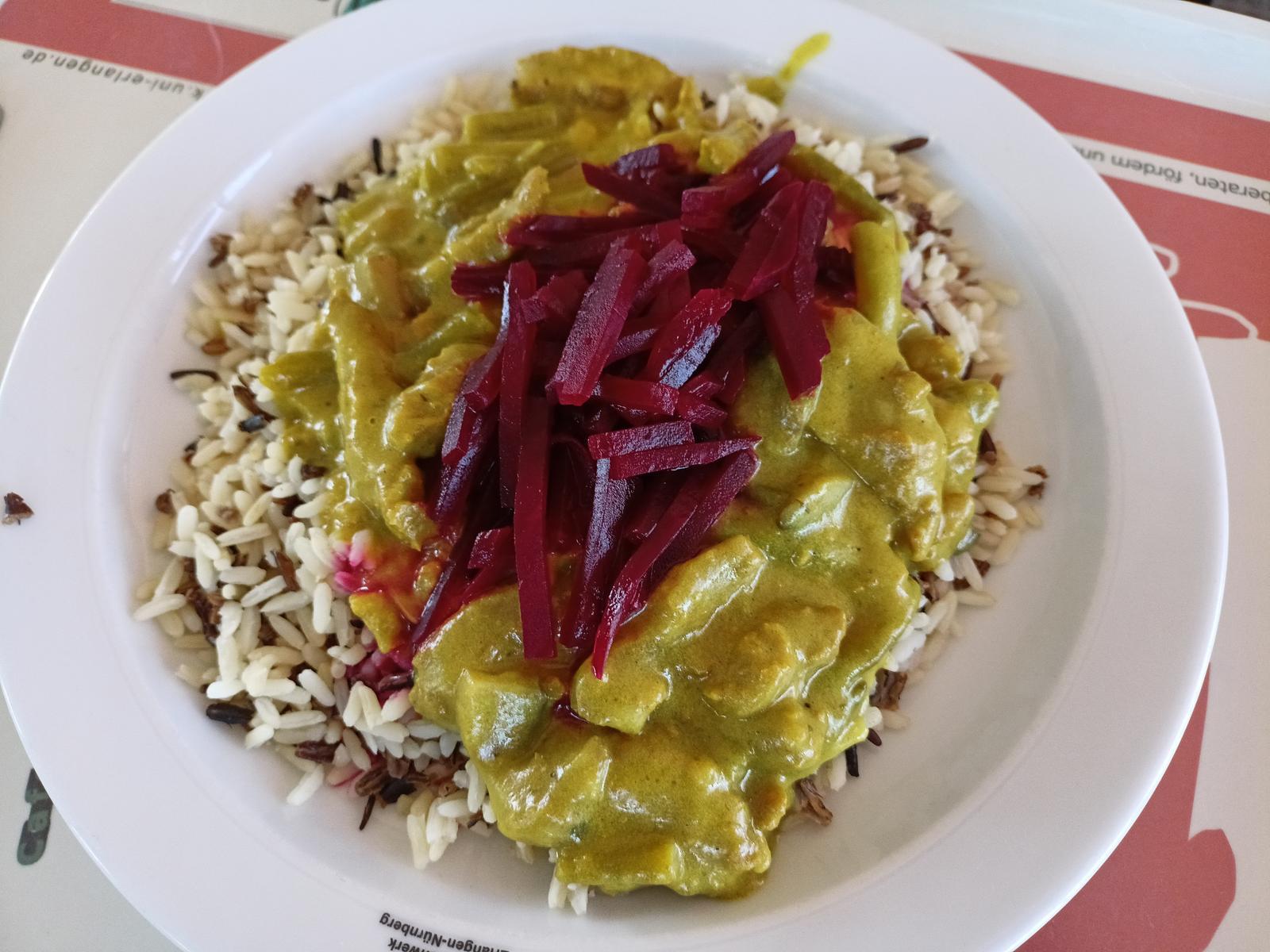 | Heute ohne rote Bete Streifen, aber echt lecker! Die Portion war groß genug um satt zu werden, der Reis nicht zerkocht und das Gemüse noch leicht bissfest. Die Sojastreifen hatten eine gute Konsistenz, könnten nach meinem Geschmack aber etwas mehr gewürzt sein.Ein sehr solides Gericht, ich vergebe 4,5/5 Sternen | |
