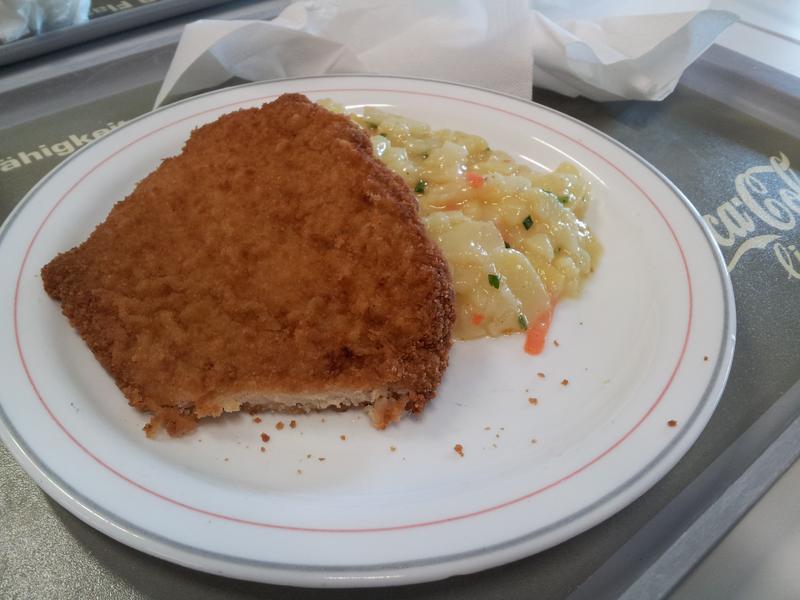 | Schnitzel: Panade ziemlich lätschig, nicht besonders ansprechend Kartoffelsalat: nicht überrangend aber uach nicht ungenießbar Fazit: Mensamittelmaß 3/5 | |