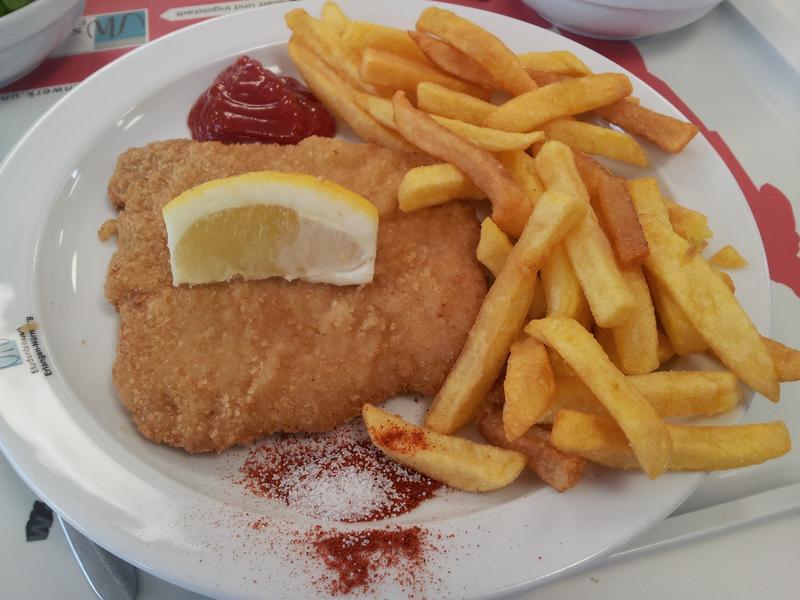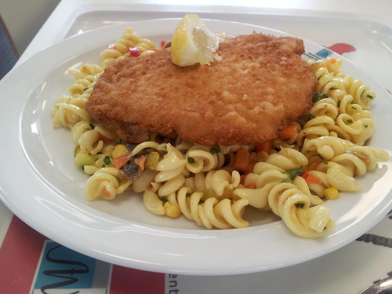 | Das Schnitzel war ziemlich trocken, aber ganz gut essbar. Als Beilage kann ich den Nudelsalat empfehlen. Die Portion ist für den großen Hunger allerdings zu klein | |