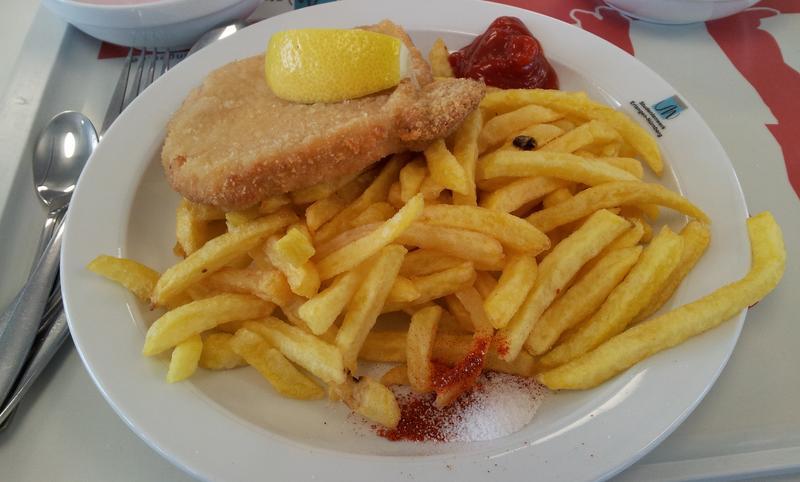 | Heute gabs das Schnitzel mit Pommes. Es hat ein bisschen wie vom Freibadkiosk geschmeckt, also klar, dass man es nicht mit einem Restaurant vergleichen kann. An sich ne solide Nummer, v.a. für den Preis, gibt ne 4/5 | |