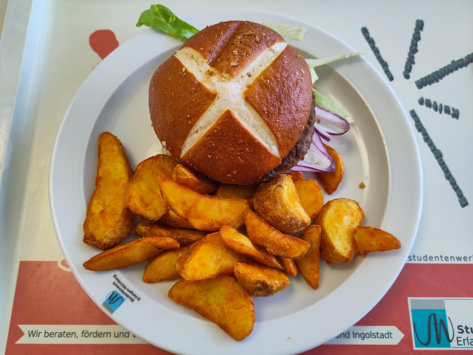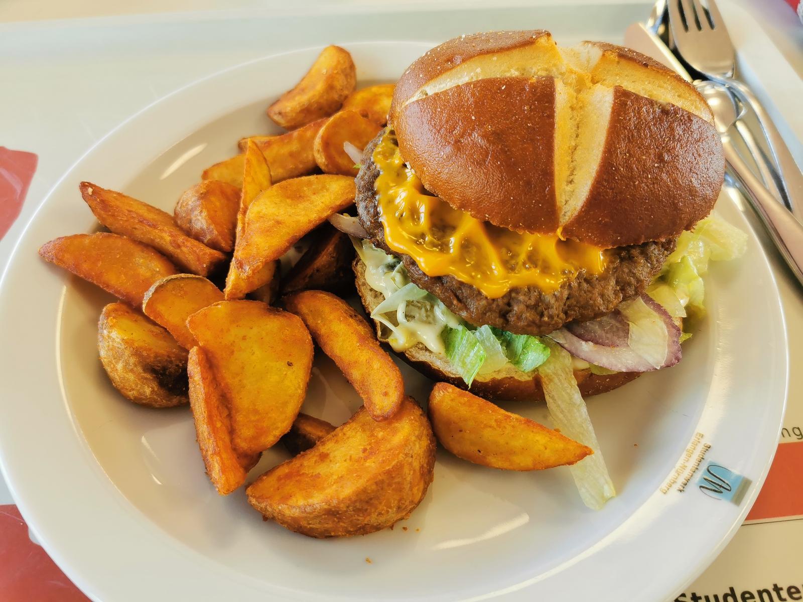 | Fast ein klassischer Cheeseburger. Allerdings gabs statt geschmolzenem Käse eine Käsesoße. Ein kleines Highlight war die Chilisoße. Die hatte überraschenderweise Geschmack, sogar recht guten. Es waren kleine eingelegte Gürkchen und Jalapenos drin. Leider waren die Brötchen eiskalt. Nach kleinen Abzügen 4/5. | |