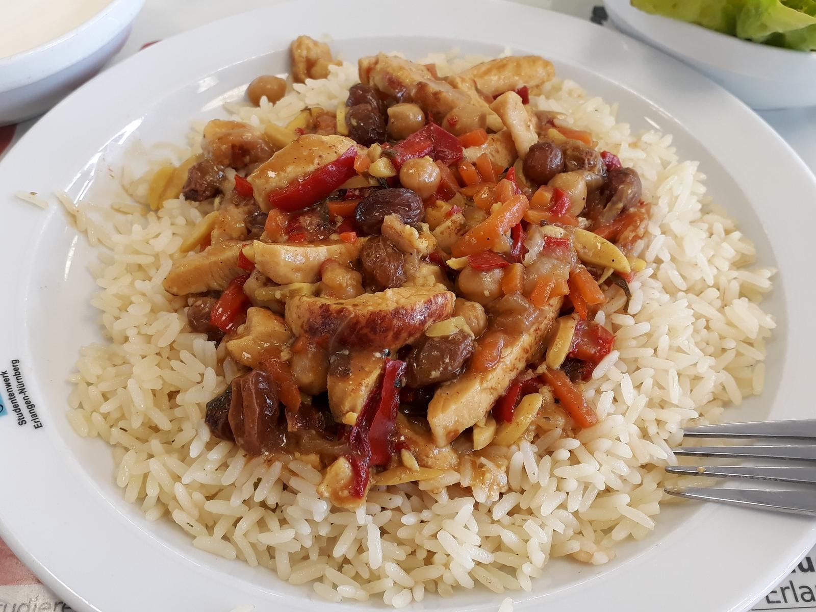 (242)| Trotz der vielen verschiedenen Zutaten geschmacklich relativ eintönig. Schmeckte hauptsächlich nach Rosinen und Salz, für das Tajine braucht man schon gute Geschmacksnerven. Mit Salat und Grillgemüse extra ging es, es wäre aber gut wenn das Gericht dem Namen auch gerecht werden würde. Nur 2/5, kann noch verbessert werden. | |